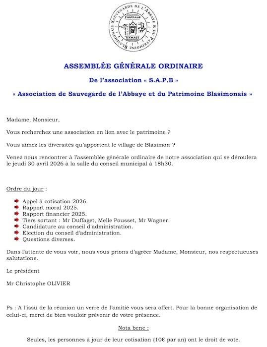 Assemblée générale de l’association pour la sauvegarde de l’abbaye et du patrimoine de Blasimon, SAPB