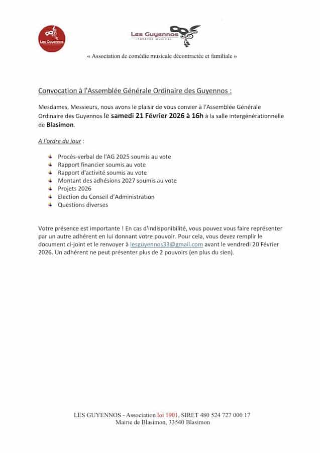 Votre présence est importante ! En cas d’indisponibilité, vous pouvez vous faire représenter par un autre adhérent en lui donnant votre pouvoir. Un adhérent ne peut présenter plus de 2 pouvoirs (en plus du sien).